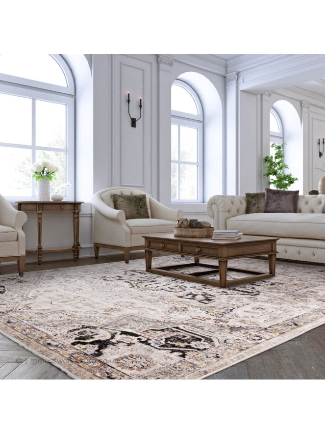 This item is part of the Sovereign Rugs collection, which is a range of remarkable and stunning carpets in Persian and Oriental vintage designs. The collection fuses modern vivid colours with clean geometric patterns to produce pieces of muted distressed nature with a lush sheen that pleasantly blend with every modern décor. The rugs in this collection also feature a short pile made of polyester, which is very pleasant to the touch.