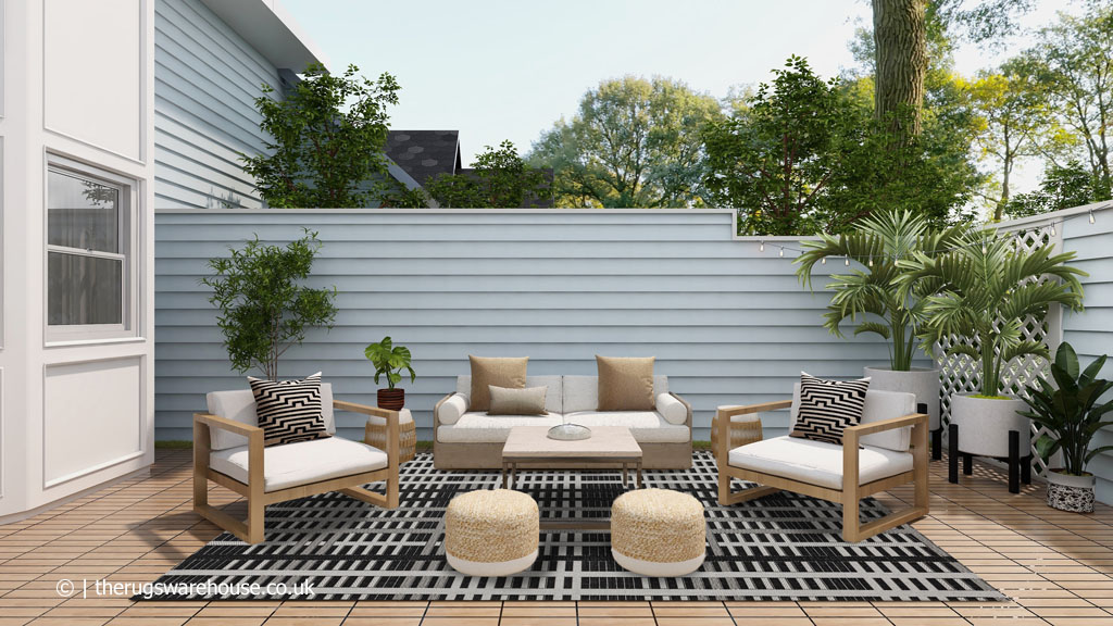 This item is part of the Patio Rugs collection, which is a range of budget outdoor neutrally coloured carpets. The rugs are made using hard-wearing polypropylene, which is suitable for use indoors as well as outdoors. In addition the rugs feature simple geometrical designs using a maximum of two neutral colours, which makes them suitable for any setting.